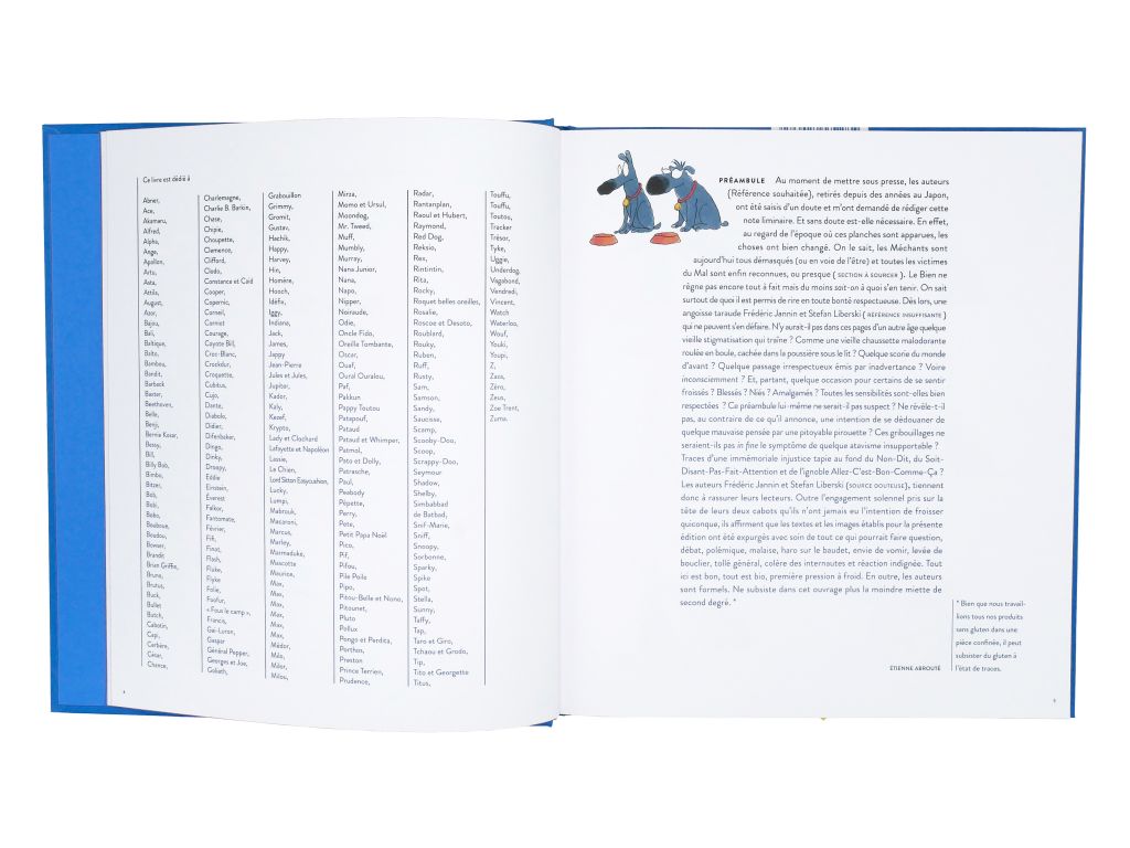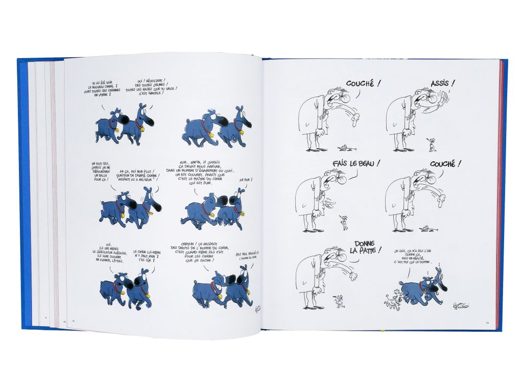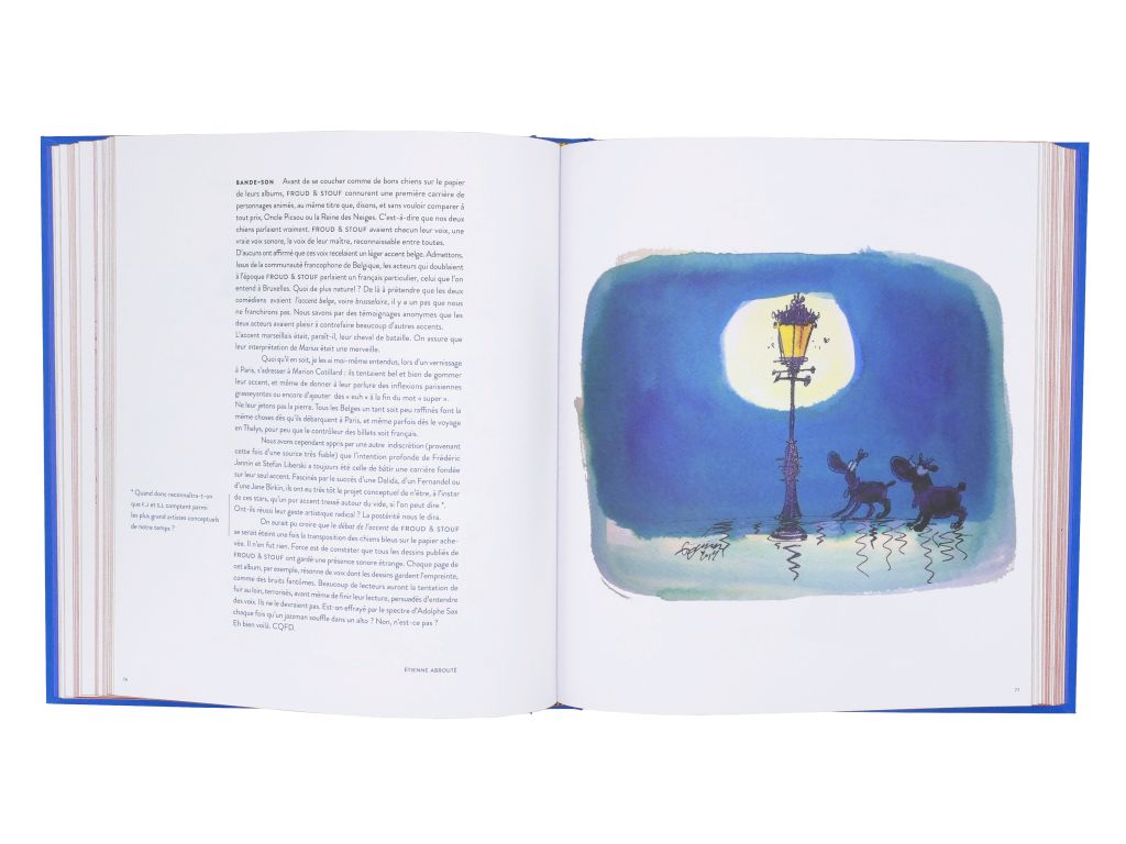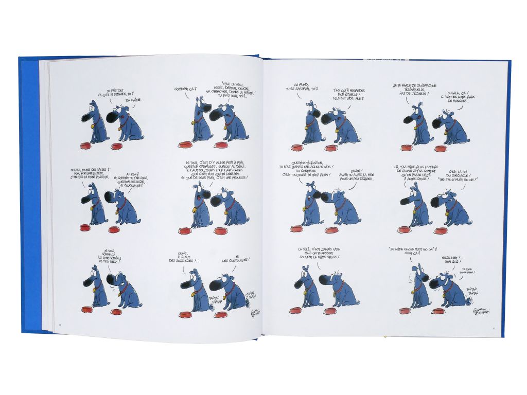 Froud and Stouf are two little blue dogs (quiet) philosophers with the likable and debonair look created by Frédéric Jannin (drawings) and Stephan Liberski (scenario). Froud and Stouf converse and carry a funny and amused but still relevant look on the world around them. Two comic book albums have been released in the past, it was time to make available again the quirky and funny discussions of our Belgian dogs in an edition that pays tribute to them. This volume contains most of the boards already published inthe first two books with added added stories published in Spirou and elsewhere and many new drawings.