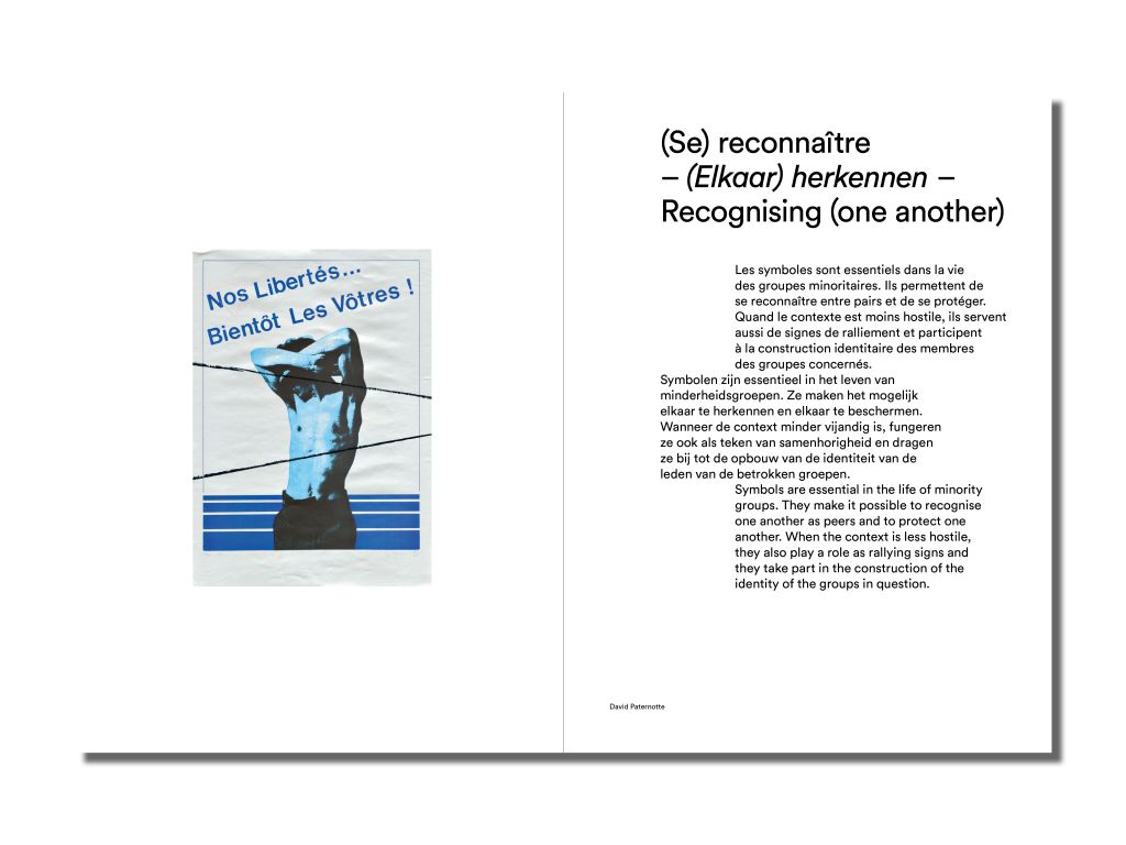 Dès les années 1950, les communautés LGBTQI+ à Bruxelles développent un langage visuel qui assure une certaine visibilité à leurs membres et leurs activités. Cette grammaire visuelle traduit et transmet des engagements vis-à-vis d’identités et de valeurs partagées. Elle permet d’informer et de représenter, de dissimuler et de révéler, de se reconnaître et de se rencontrer, de subvertir et de contester, de partager les joies et les peines, de fêter, de draguer et d’aimer. Marqué par la lutte et la célébration, l’agitation et le compromis, le graphisme se fait outil de résistance, de reconnaissance et de résilience. Évoluant au fil des décennies, il promeut des formes alternatives de collectivité.