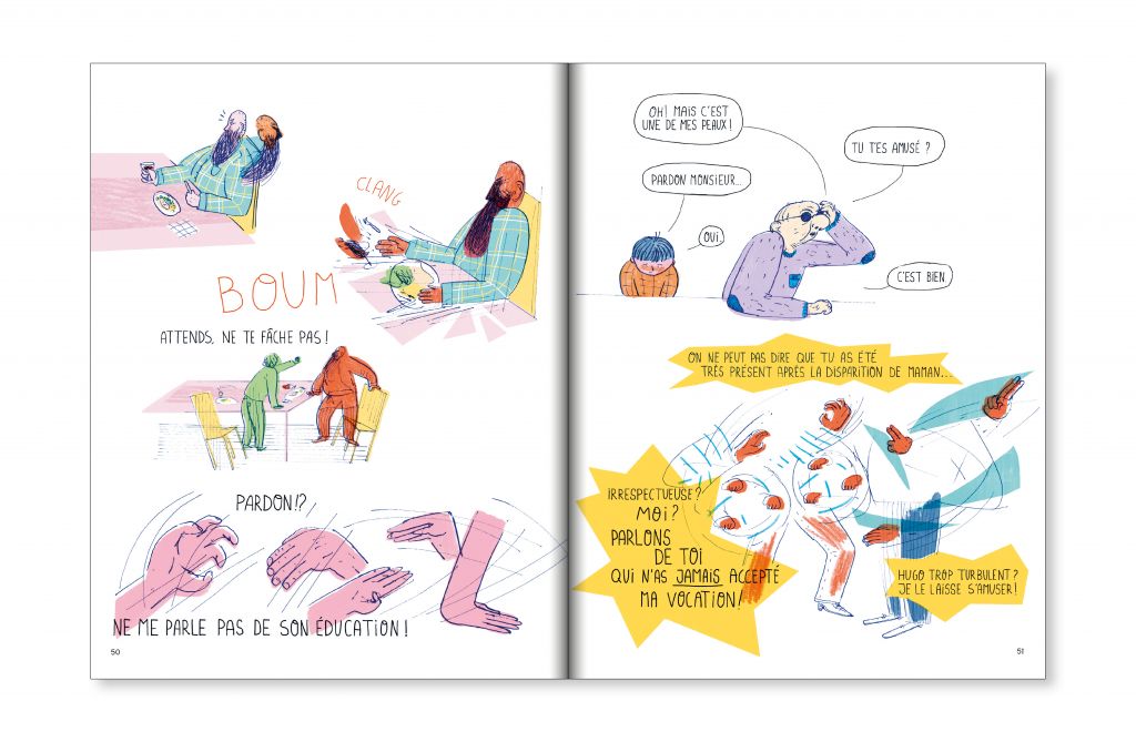 Pas toujours facile de comprendre Papy, Hugo fait pourtant des efforts. Il ne connaît pas la langue des signes que parfois Maman lui traduit. Comme Papy s'exprime avec vivacité, c'est compliqué. En plus, sa grande barbe et ses gestes rapides lui font un peu peur. Hugo rêve surtout de découvrir tous les outils mystérieux de l'atelier, cette pièce où il n'a pas le droit d'aller.