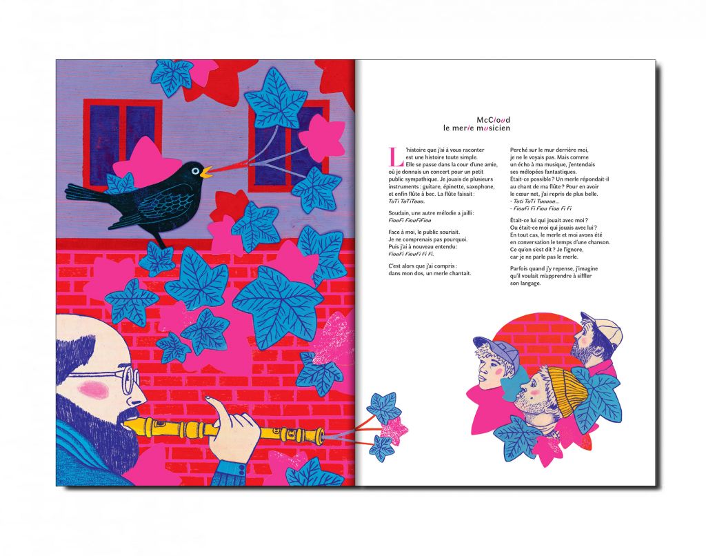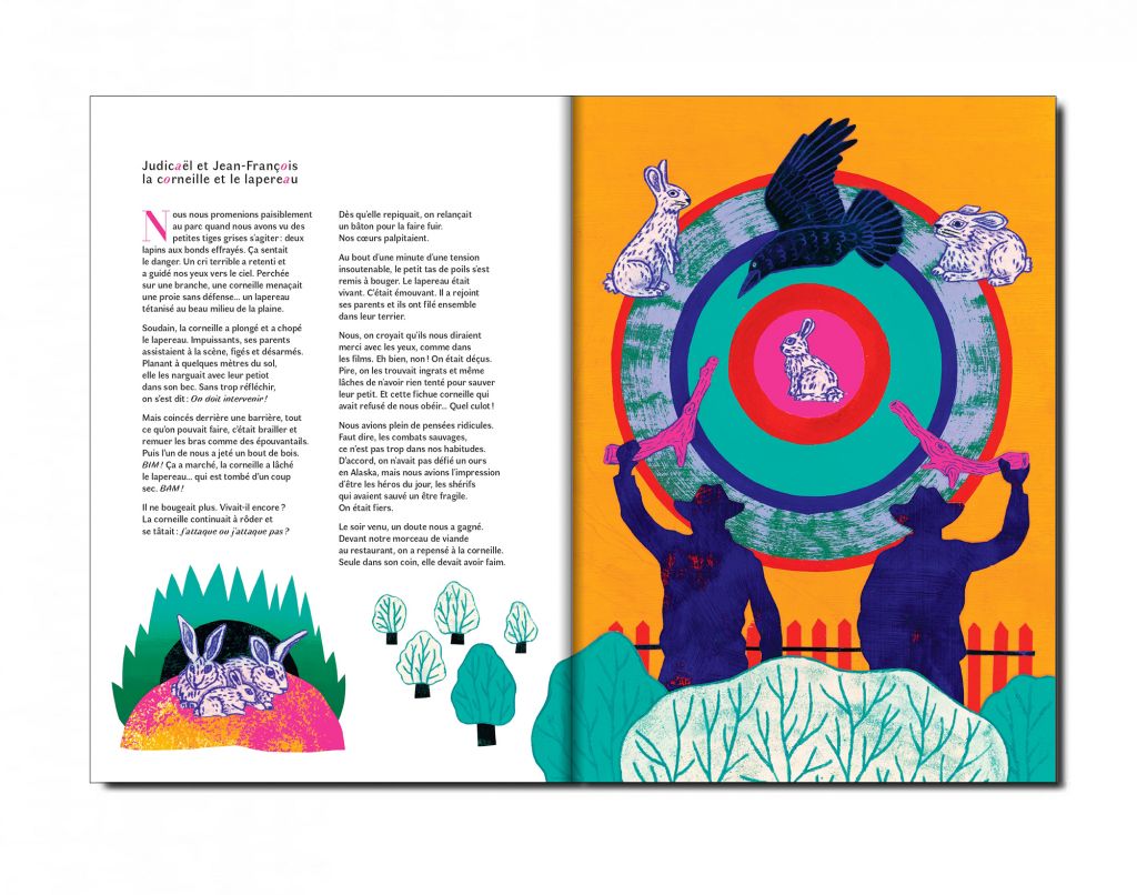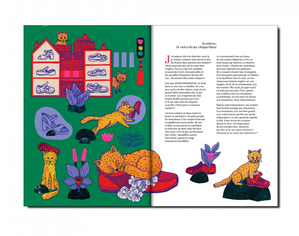 Sous-titré Histoires vraies de rencontres urbaines et sauvages, cet album se situe entre réalisme et fantaisie. Nous découvrons des renardeaux voleurs de chaussures, des fourmis mangeuses de crottes de nez, un grand-duc en convalescence, un merle s’invitant à un concert ou encore un lapereau sauvé de l’appétit d’une corneille par des shérifs improvisés…