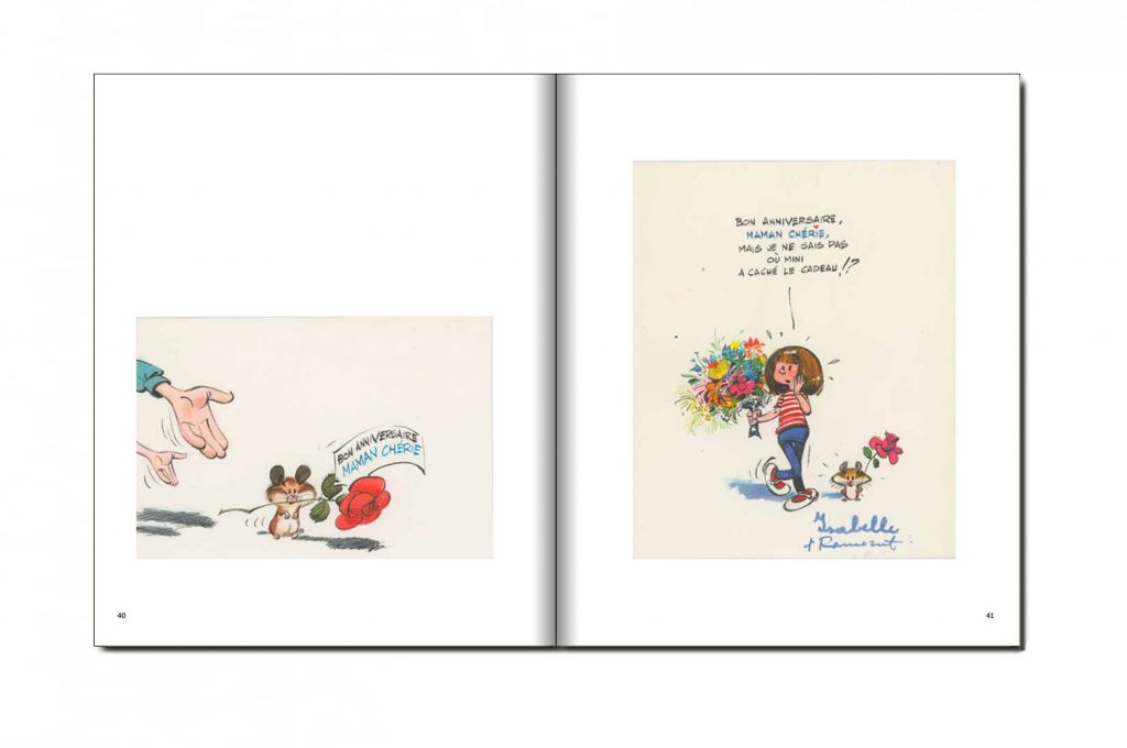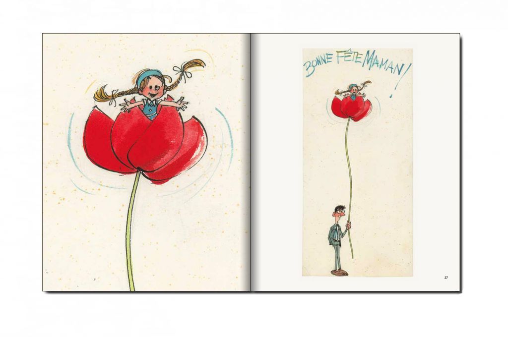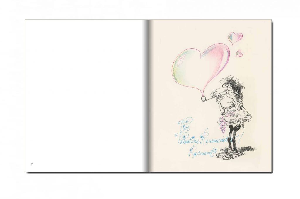 Quand on est un dessinateur de renom pris par la création et le rythme des publications qui se suivent, le temps manque pour courir les magasins à la recherche d’hypothétiques cadeaux et présents pour ses proches. Franquin avait trouvé la solution. À la fois aisée, pratique et ô combien personnelle, la trace sur le papier de «vœux» et autres « bons pour » est devenue pratique courante dans la famille Franquin. Bouquets croqués, présents dessinés étaient offerts dans l’attente que les cadeaux se matérialisent plus tard… Les dessins que l’on retrouve n’ont jamais eu pour vocation d’être publiés un jour. Conçus et imaginés pour les anniversaires ou les fêtes comme la Saint Valentin, ils ont cette saveur des dessins rares que l’on découvre avec curiosité. C’est un privilège que de pouvoir admirer ces dessins inédits couvrant une période allant des années 1950 aux années 1990. On appréciera le travail du dessinateur multipliant les techniques, passant du pinceau à la plume, du Rotring au crayon ou encore utilisant un simple stylo. On sera aussi frappés par l’usage de la couleur et l’évolution du style de Franquin liée aux époques qu’il traverse. Modestement inaugurés par deux premiers « bons pour » destinés à ses beaux-parents, Franquin prendra vite goût à l’exercice en sophistiquant ses petits dessins devenant des petits bijoux de graphisme et d’inventivité. Ils vont aussi exprimer la profonde affection et la bienveillante générosité de l’auteur pour ses proches.