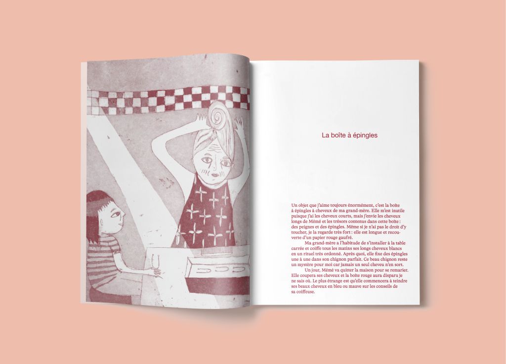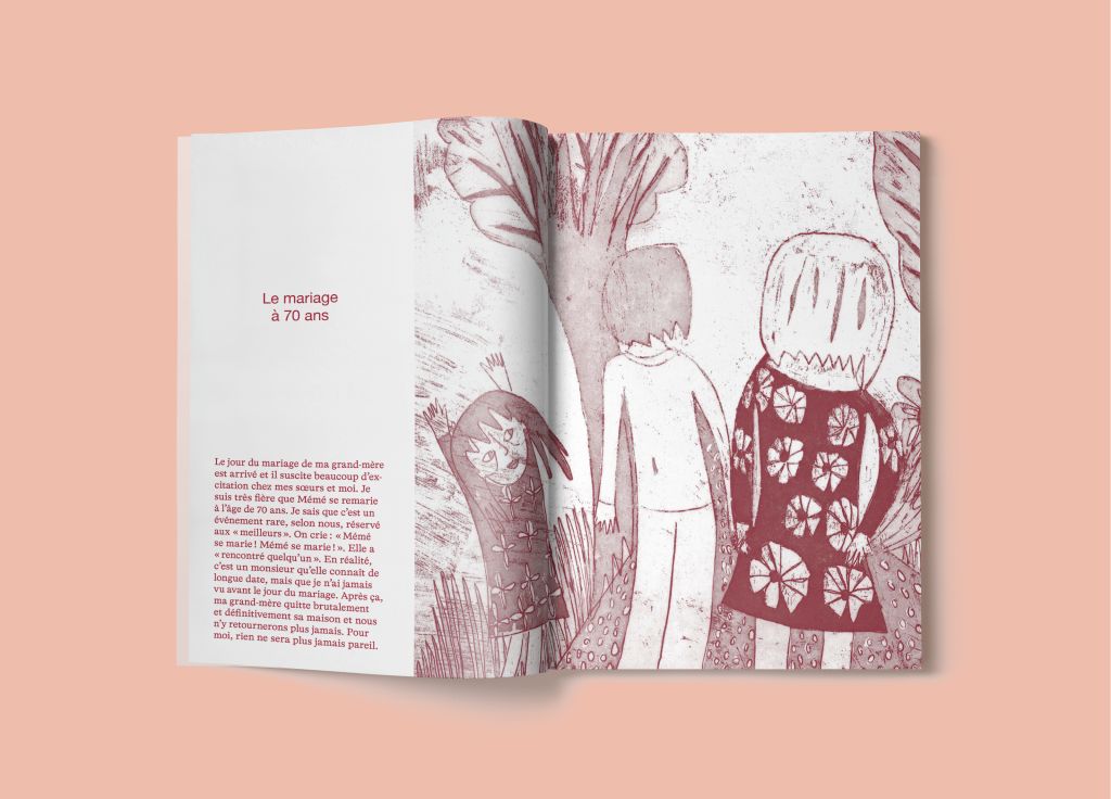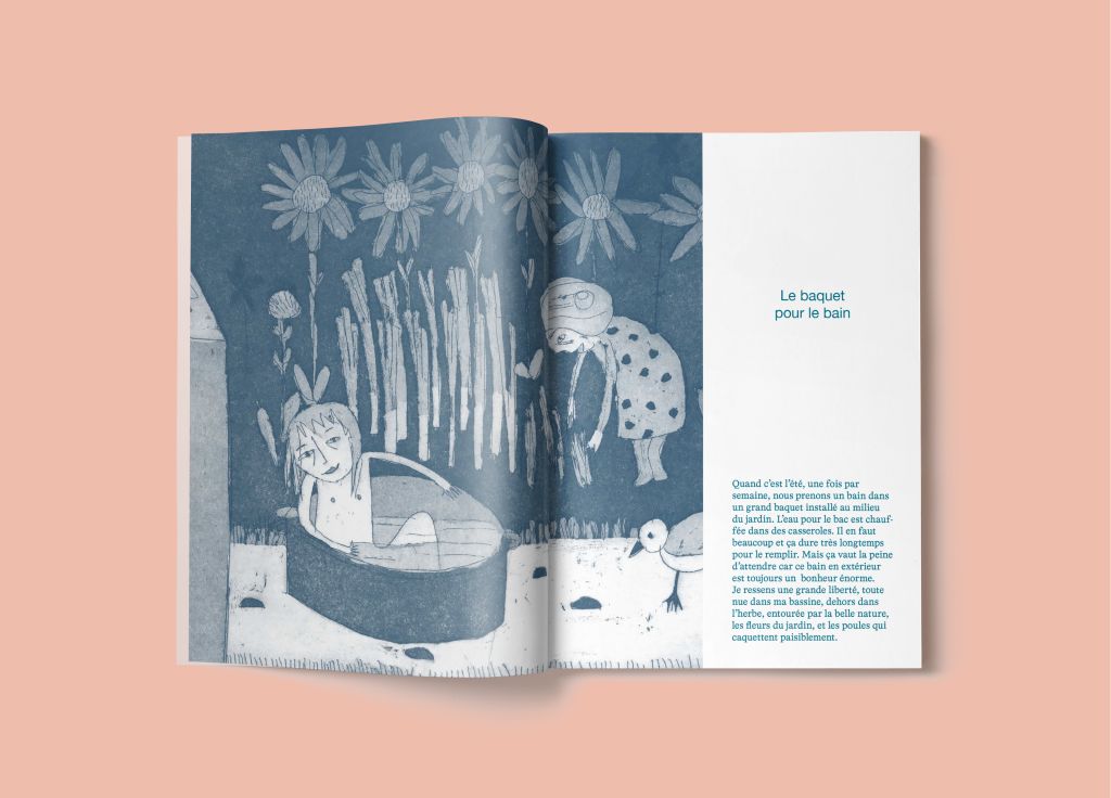 Habituée à la gravure sur bois ou sur lino, Catherine Le Goff a choisi l'eau-forte et l'aquatinte pour retranscrire en de tendres monochromes la douceur de ses souvenirs d'enfance chez sa grand-mère.